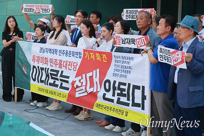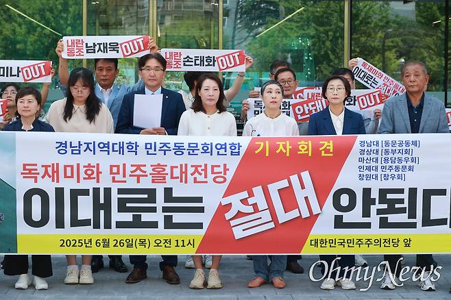경남대 동문공동체, 경상국립대 민주동문회 동부지회, 마산대 용담동우회, 인제대 민주동문회, 국립창원대 창우회로 구성된 '경남지역대학 민주동문회연합'이 26일 오전 창원마산 대한민국민주주의전당(아래 민주전당) 앞에서 이같이 외쳤다.