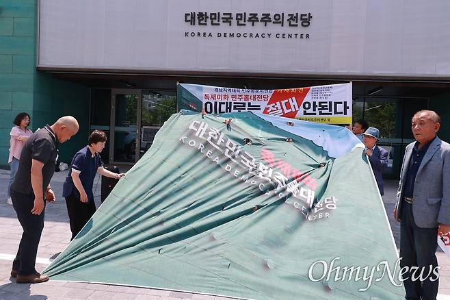 참가자들은 "독재미화 민주홀대 전당"이라고 새겨진 펼침막을 찢는 상징의식을 갖기도 했다. 다음은 회견문 전문이다.