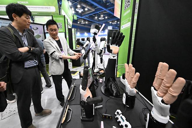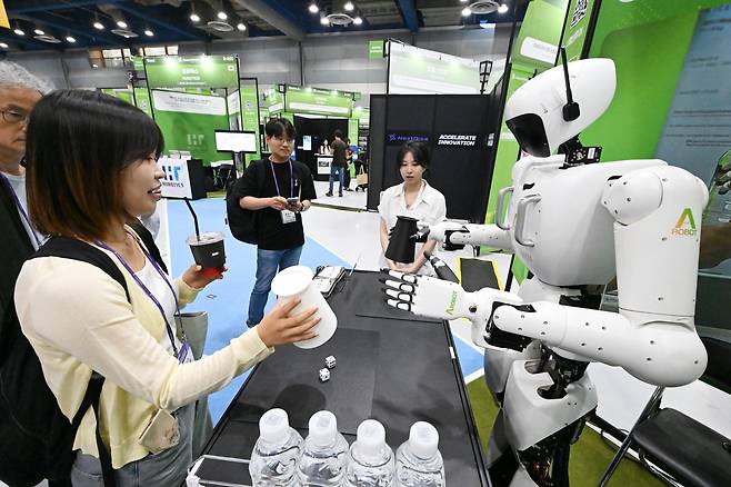 넥스트라이즈 2025가 개최한 26일 서울 강남구 코엑스에서 관람객이 로봇과 주사위 게임을 체험하고 있다.