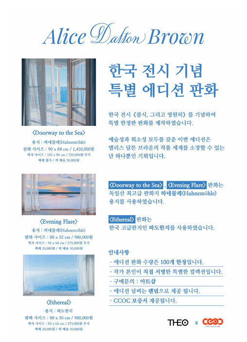 '빛과 바람의 화가' 앨리스 달튼 브라운(Alice Dalton Brown)의 회고전이 열리고 있는 가운데, 국내 첫 한정판 판화 작품을 판매합니다.