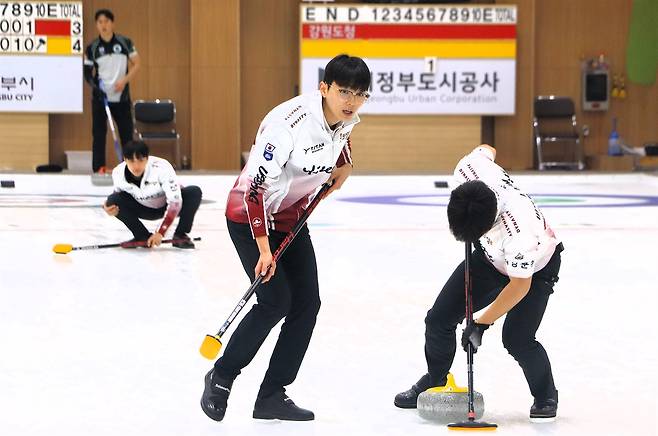 | ▲ 지난 2025 하얼빈 동계 아시안 게임 대표팀으로 출전했던 의성군청 남자 컬링팀 선수들이 2025 한국컬링선수권 경기에 나서고 있다. |