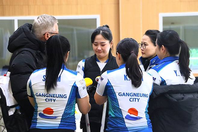 | ▲ 이번 국가대표 선발전 최종전을 마친 강릉시청 '팀 킴' 선수들이 피터 갤런트(맨 왼쪽) 코치의 말을 듣고 있다. |