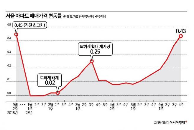 한국부동산원이 26일 발표한 '6월 넷째 주(23일 기준) 주간 아파트 가격 동향'을 보면 서울 아파트 매매가격은 전주 대비 0.43% 상승하며 21주 연속 올랐다. 이는 지난주(0.36%) 오름폭을 다시 웃도는 수치로, 2018년 9월 둘째 주(0.45%) 이후 가장 높은 주간 상승률이다.