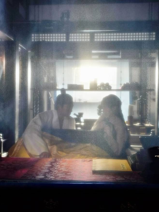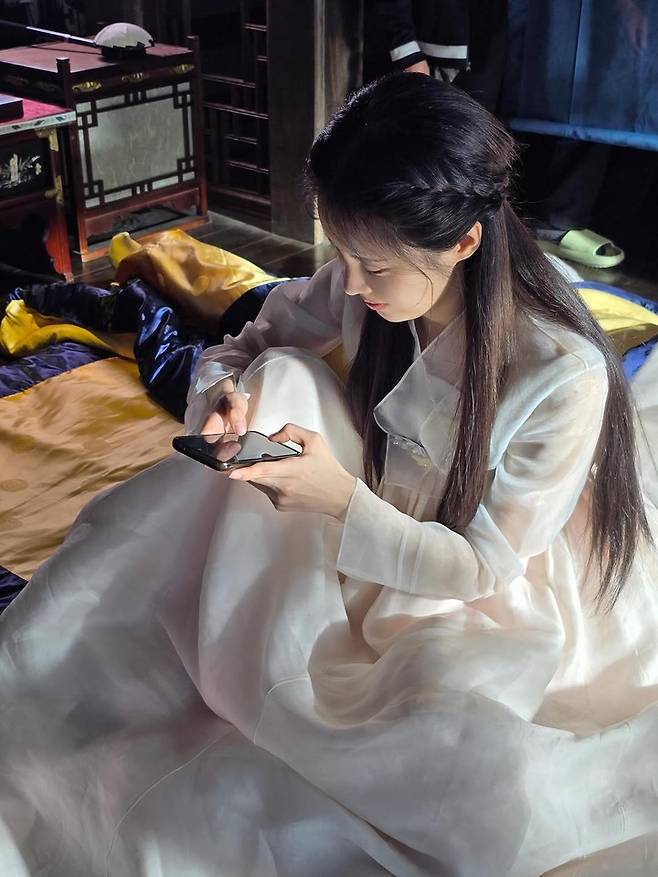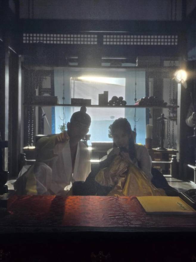 고전 한복 입고 촬영 중 감정을 담은 포즈, 첫날밤 장면 준비 중