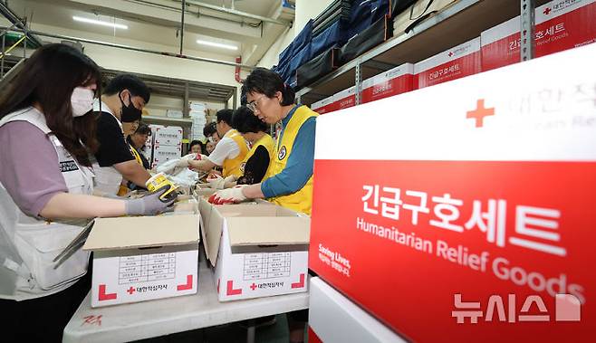 [인천=뉴시스] 전진환 기자 = 26일 오후 인천 연수구 대한적십자사 인천지사에서 직원과 봉사원들이 여름철 풍수해 대비 긴급구호세트 및 비상식량세트를 제작하고 있다. 2025.06.26. amin2@newsis.com