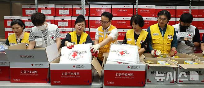 [인천=뉴시스] 전진환 기자 = 26일 오후 인천 연수구 대한적십자사 인천지사에서 직원과 봉사원들이 여름철 풍수해 대비 긴급구호세트 및 비상식량세트를 제작하고 있다. 2025.06.26. amin2@newsis.com