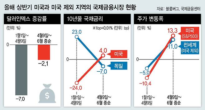 트럼프 행정부의 상호 관세 정책 불확실성과 지난 1분기 미국 경제의 역성장, 재정적자 악화 우려로 주식·자금·채권시장에서 미국의 초강세 지위가 흔들리는 현상이 감지되고 있다는 것이다.