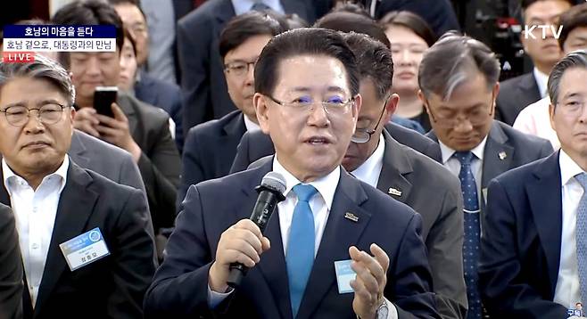 이 대통령은 지난 25일 광주에서 주재한 타운홀 미팅에서, 산단 개발·기업 유치·송전망 구축 등 전남 지역 발전 관련 김 지사 답변을 수차례 제지했다.