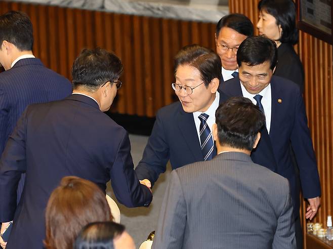 이재명 대통령이 26일 국회 본회의장에서 취임 후 첫 추가경정예산(추경) 시정연설을 마친 뒤 국민의힘 권성동 의원과 악수를 하고 있다. 2025.06.26 대통령실사진기자단 김호영기자