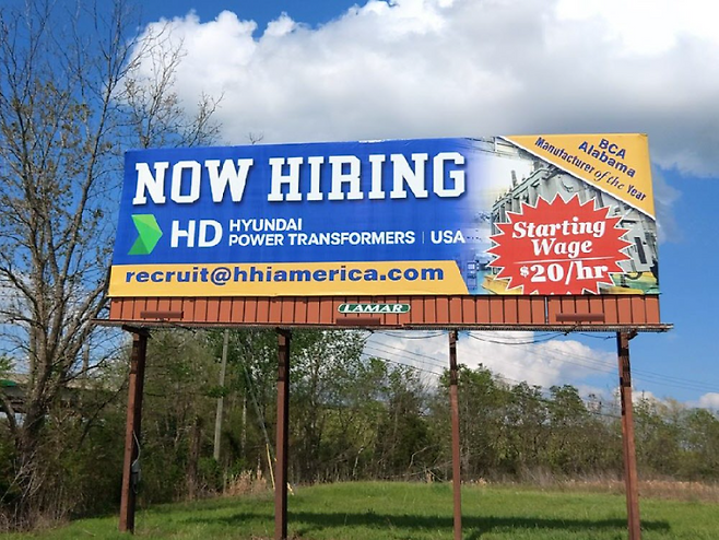 미국 조지아주 애틀랜타 도심에서 I-85번 고속도로 타고 앨라배마주로 향하는 길에 HD현대일렉트릭 앨라배마 법인이 세운 커다란 구직 광고판이 눈에 들어왔다. 광고판 한쪽에는 ‘시간당 20달러’라는 임금 조건도 적혀 있다. 앨라배마주의 시간당 최저 임금이 8달러 안팎인 점을 고려하면 두 배 이상이다. 미국 현지서 본 광고판은 HD현대일렉트릭의 위상을 말해주고 있었다. 밀려드는 변압기 주문에 최저 임금의 두 배 이상을 주고서라도 인력을 수시 채용 중인 HD현대일렉트릭은 미국 진출 국내 기업 중 가장 가파른 성장 곡선을 그리고 있다.