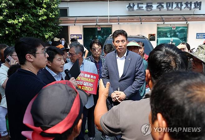 (광주=연합뉴스) 조남수 기자 = 26일 오후 광주 광산구 삼도동 행정복지센터에서 열릴 예정이던 자원회수(소각)시설 환경영향평가 초안 주민설명회에 참석하려던 광주시 관계자가 행사장 밖에서 주민들과 대화하고 있다. 2025.6.26