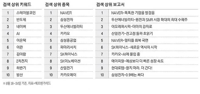 금융정보업체 에프앤가이드에 따르면 6월 18~24일 네이버가 종목 검색 순위 1위를 차지했다. 아울러 네이버 관련 보고서 'NAVER-똑똑한 기업의 발걸음'(다올투자증권 김혜영)은 보고서 검색 순위 1위에 올랐다. 키워드 검색 순위에서도 '스테이블코인'과 '반도체'에 이어 네이버가 3위라는 높은 순위를 기록했다. 네이버는 새 정부 AI 투자 확대에 따른 대표 수혜주로 부상하며 이 기간 주가가 40% 이상 단기 급등했다. 특히 네이버 출신 인사들이 잇달아 정부 고위직에 발탁되면서 기대감에 불을 지폈다. 지난 15일 하정우 네이버클라우드 AI 혁신센터장이 대통령실 초대 AI미래기획수석으로 임명된 데 이어, 23일에는 한성숙 전 네이버 대표이사가 중소벤처기업부 장관 후보자로 지명된 바 있다.