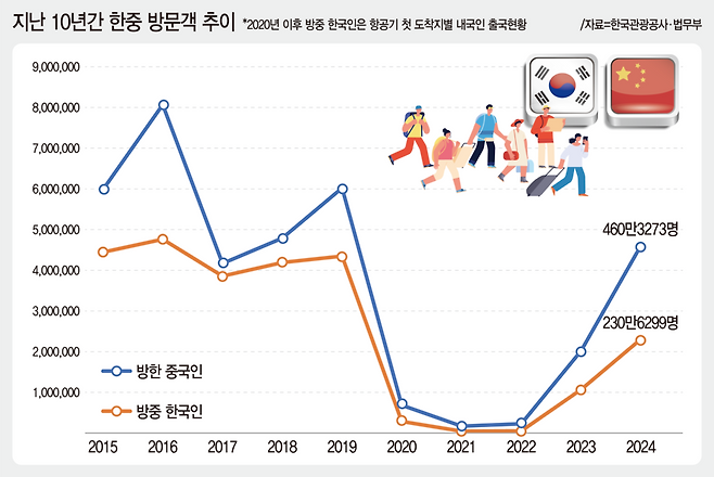 최근 한중 관계에서도 회복의 조짐이 나타나고 있다. 2017년 사드 사태 이후 교류가 크게 위축되었으나, 2024년 들어 인적 교류가 빠르게 회복되고 있다. 2024년 한국을 찾은 중국인 관광객은 약 460만 명으로 전년 대비 128% 증가했다. 중국을 방문한 한국인 수도 무비자 입국 재개의 영향으로 큰 폭으로 늘었다. 민간 교류의 숨통이 다시 트이고 있는 것이다.