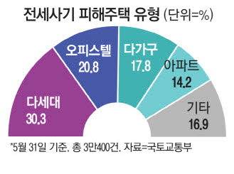 피해주택 유형은 다세대 비중(30.3%)이 가장 컸지만 오피스텔(20.8%)과 다가구(17.8%), 아파트(14.2%)에도 상당수 거주하는 것으로 나타났다.