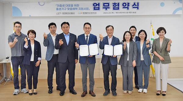 제주개발공사(사장 백경훈)는 26일 제주특별자치도 사회서비스원(원장 문원일)과 '저출생 대응을 위한 출생가구 맞춤혜택 지원사업 업무협약'을 체결했다.