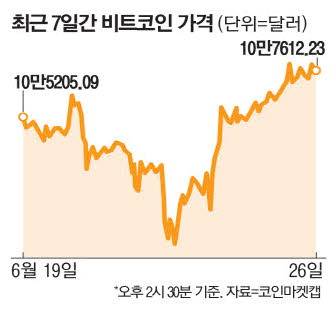 이처럼 가상자산이 제도권에 편입될 수 있다는 기대감이 커지자 비트코인도 한때 10만8000달러를 돌파했다. 코인마켓캡에 따르면 비트코인은 26일 한때 10만8305.54달러에 거래됐다. 이후 상승폭을 줄이며 이날 오후 2시 30분 기준 10만7612.23달러를 기록했다.