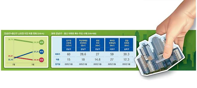 대표적으로 30대 후반 A씨는 역삼동 한 아파트를 올해 5월 28억6000만원에 사들였다. 이 주택 등기부등본을 살펴보면 근저당권 설정액은 약 18억원이다. 강남3구와 용산구에 적용되는 주택담보대출비율(LTV) 규제가 50%인 점을 고려하면 A씨는 집값의 절반까지 최대한 대출을 일으켜 주택 매입에 나선 것으로 추정된다.