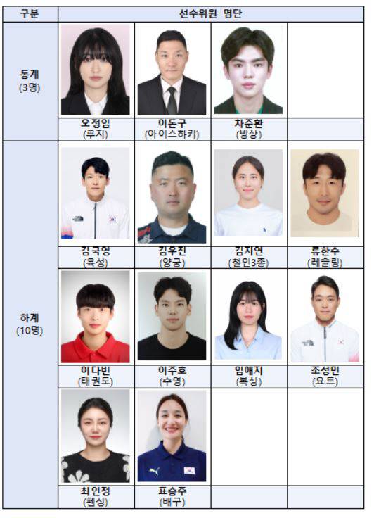 대한체육회는 26일, 39개 종목 713명의 '국가대표' 선거인단이 직접 뽑은 10명의 선수위원 명단을 발표했다. 25일 중앙선거관리위원회가 관할하는 온라인 투표를 통해 김국영(육상), 김우진(양궁), 김지연(철인3종), 류한수(레슬링), 이다빈(태권도), 이주호(수영), 임애지(복싱), 조성민(요트), 최인정(펜싱), 표승주(배구·이상 가나다순) 등 하계종목 총 10명의 선수위원이 당선의 영예를 안았다. 11일 동계종목에서 무투표 당선된 오정임(루지), 이돈구(아이스하키), 차준환(빙상)을 포함, 13명의 선출위원 자리가 모두 채워졌다. 선수위원의 임기는 대한체육회장 임기와 동일한 4년. 선수위원회는 올림픽 및 각종 국제대회 관련 페어플레이 정신 함양, 올림픽 정신의 보급과 확산, 선수 권익 보호 및 증진, 은퇴선수 지원 자문 등 다양한 기능을 수행하게 된다.