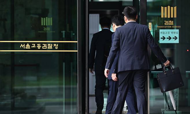 | 입장 ‘12·3 비상계엄’과 관련해 조은석 특별검사팀과 윤석열 전 대통령 측이 출두 시간과 지하주차창 출입 문제로 신경전을 벌이는 가운데 소환조사 예정일을 이틀 앞둔 26일 특검 사무실이 마련된 서울 서초구 서초동 서울고등검찰청 청사로 검찰 관계자들이 들어가고 있다. 연합뉴스 |