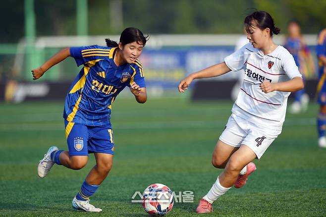 울산 현대고 류지혜(왼쪽)가 26일 경남 합천에서 열린 ‘2025 스포츠케이션 명품도시 합천에서 펼쳐지는 제33회 여왕기 전국여자축구대회’ 고등부 경북 포항여전고와 준결승전에서 포항여전고 한소연을 상대로 돌파를 시도하고 있다. 2025. 6. 26.