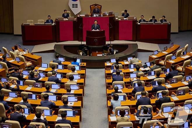 (서울=뉴스1) 허경 기자 = 이재명 대통령이 26일 서울 여의도 국회에서 추가경정예산(추경) 시정연설을 하고 있다. (대통령실 제공. 재판매 및 DB 금지) 2025.6.26/뉴스1