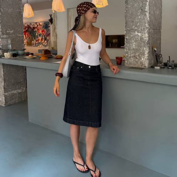 크세니아 는 무릎을 살짝 덮는 애매한 기장의 데님 스커트 를 보디슈트와 매치해 신선한 스타일링을 보여줬습니다. 그리고는 갈색 스카프와 뱅글, 펜던트까지 톤을 맞춘 액세서리를 더하는 센스를 발휘했죠. 여기에 가벼운 플립플랍으로 룩을 느끼하지 않게 마무리한 것이 포인트! 아이템 선택의 강약만 잘 조절해도 세련된 패션을 완성할 수 있답니다. Tip 휴양지에선 보디슈트 대신 원피스 수영복으로 크세니아처럼 즐겨보세요.
