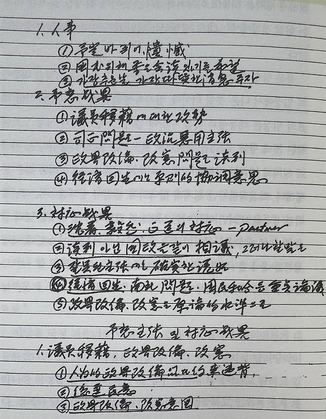 | ▲ 2001년 1월 4일 이회창 한나라당 총재와의 영수회담을 앞두고 김대중 대통령이 정리한 국정노트의 첫 장. '1.인사 2.예상 전략 3.대응 전략..' 순서로 정치현안에 관해 할 이야기들을 상세하게 적었다. 김대중 대통령이 꼼꼼한 성격과 치밀함을 엿볼 수 있다. |