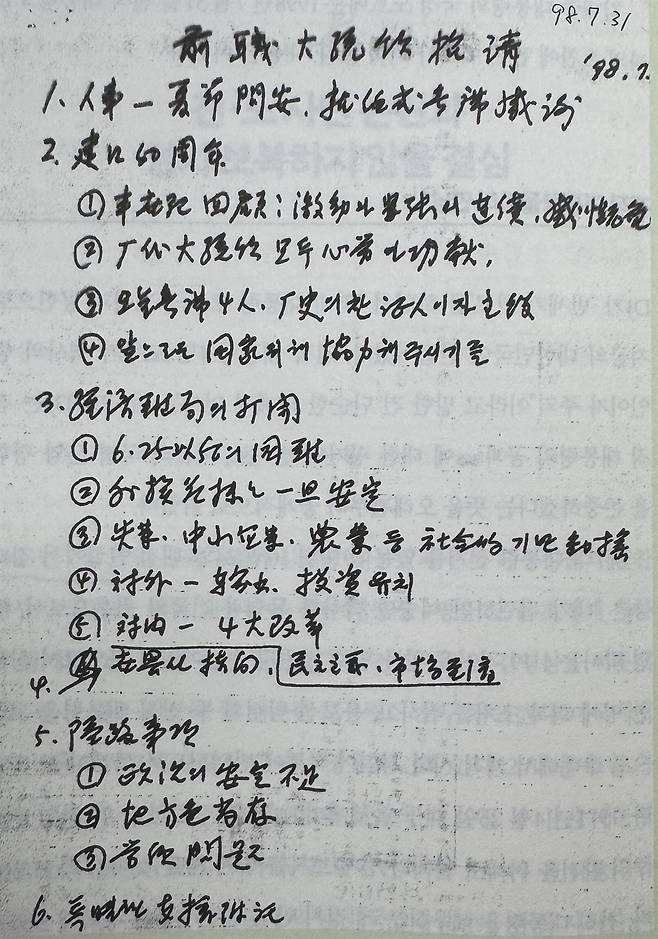 | ▲ 김대중 대통령이 1998년 7월 전직 대통령들과의 만찬을 앞두고 작성한 국정노트. 자신을 사형시키려 했던 전두환·노태우 전 대통령에 대한 감정은 전혀 내비치지 않고, 국정운영을 위해 특별히 지원해 달라고 부탁하고 있다. |
