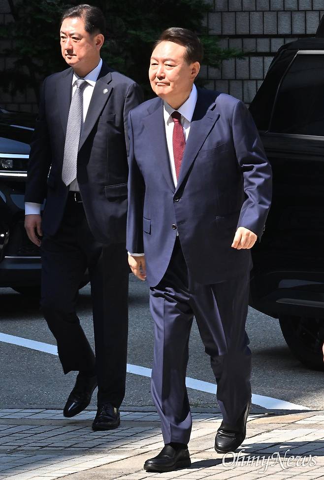 | ▲ 윤석열 전 대통령이 23일 서울 서초구 서울중앙지방법원에서 열린 내란 우두머리 혐의·직권남용 권리행사 방해 혐의 사건 8차 공판에 출석하고 있다. |