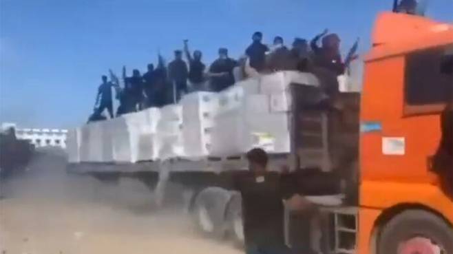 ▲ 구호품 트럭 올라탄 팔레스타인 무장대원들