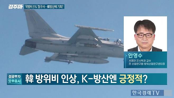 안영수 서경대 군사학과 교수는 26일 한국경제TV에서 "국방비의 30% 이상이 방위비에 지출되고 있다"며 "한국이 국방비를 늘릴 경우, 국내 방산업체에 호재가 될 것"이라고 말했다.