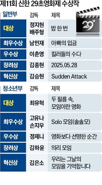 일반부 최우수상은 남민재 감독의 작품 ‘아빠의 입금’에 돌아갔다. 표현은 서툴러도 가족 여행이라는 모임을 위해 매번 뜻밖의 입금으로 마음을 쌓는 아빠 이야기로 가족의 의미를 되새겼다. 이날 시상식에선 일반부 대상 1300만원을 포함해 총 3400만원의 상금과 상품, 상패가 수상자들에게 주어졌다. 시상은 진옥동 신한금융그룹 회장과 김정호 한국경제신문 사장 등이 맡았다. 시상식엔 수상자를 비롯해 영화제에 출품한 감독과 수상자 가족, 친구 등이 모여 축제 분위기를 더했다. 29초영화제가 최근 영상 패러다임인 ‘숏폼’ 트렌드에 부합하는 만큼 수상작 상영에 관심이 높았다.