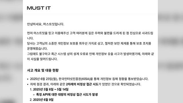 머스트잇은 "자체 점검 결과 2차례의 비정상 접근 시도가 있었던 것으로 확인됐다"며 "지난달 6일부터 14일까지 특정 API(애플리케이션 프로그래밍 인터페이스)에 대한 대량의 비정상 접근 시도가 있었고, 지난 9일에도 동일한 경로를 통해 2차 시도가 감지됐다"고 밝혔습니다.
