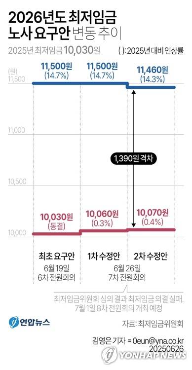 [그래픽] 2026년도 최저임금 노사 요구안 변동 추이