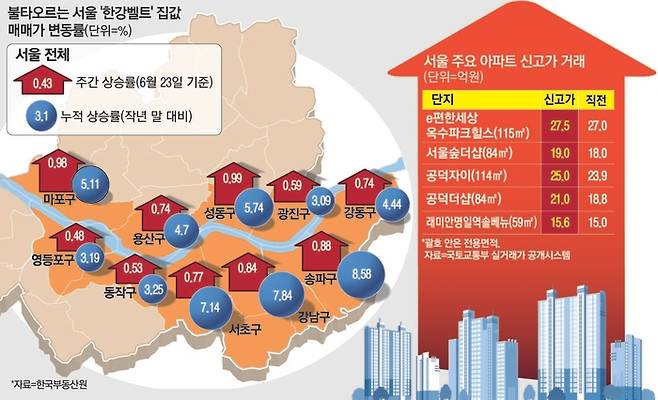 26일 한국부동산원에 따르면 이번주(23일 기준) 서울 아파트 매매가격은 0.43% 올랐다. 서울 집값은 3주째(0.26%→0.36%→0.43%) 가파르게 뛰며 올해 최대 상승률 기록을 매주 갈아치우고 있다. 특히 상승세를 견인하는 투톱이 성동구(0.99%)와 마포구(0.98%)란 점이 눈길을 끈다. 두 자치구의 집값 상승률은 서울 25개 자치구 가운데 가장 컸다.