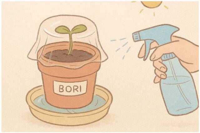 먼저 물받이에 물을 채우고, 심지를 화분 아래에 끼웠다. 심지가 젖어들며 물을 천천히 끌어올리기 시작했다. 동봉된 배양토에 물을 붓자, 흙이 조용히 부풀었다. 씨앗이 너무 작아 손으로 잡히지 않아, 이쑤시개로 살며시 흙을 헤치고 씨를 뿌렸다. 가볍게 흙을 덮은 뒤, 분무기로 표면을 적셨다. 마지막으로 랩을 씌워 화분을 밀봉하고, 따뜻한 바닥에 놓았다.
