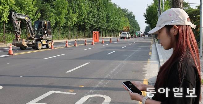| 오빠의 깨진 휴대전화 들고 선 사고 현장 서울 강동구 명일2동 싱크홀 사고로 숨진 박평수 씨의 동생 수빈 씨가 26일 사고 현장을 둘러보고 있다. 수빈 씨의 손에는 오빠가 생전에 사용하던 스마트폰이 들려 있다. 평수 씨가 싱크홀에 추락할 때 스마트폰도 부서져 액정에 금이 갔다. 도로 저편에 공사 차량들이 보인다. 홍진환 기자 jean@donga.com |