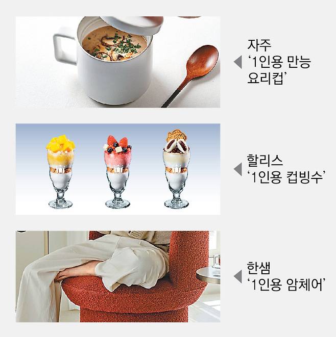 배달 음식 서비스에서도 1인 가구 대상 메뉴 구성에 변화가 나타나고 있다. 배달의민족은 ‘한그릇’ 카테고리를 통해 BBQ 치킨의 1인 세트 메뉴를 제공한다고 26일 밝혔다. 치킨은 대개 가족 또는 친구들과 함께 둘러앉아 먹는 메뉴로 인식되는데, 이를 1인용으로 간소화한 것이다. 늘어나는 1인분 배달 수요에 맞춰 배민은 한그릇 서비스를 전국 주요 지역으로 영역을 확대한 상태다. 가구업계에서도 소형 주거 공간에 적합한 1인용 가구가 주목받고 있다. 한샘은 오피스텔과 원룸 등에 적합한 크기의 암체어 ‘도도 부클 패브릭’을 출시했다.