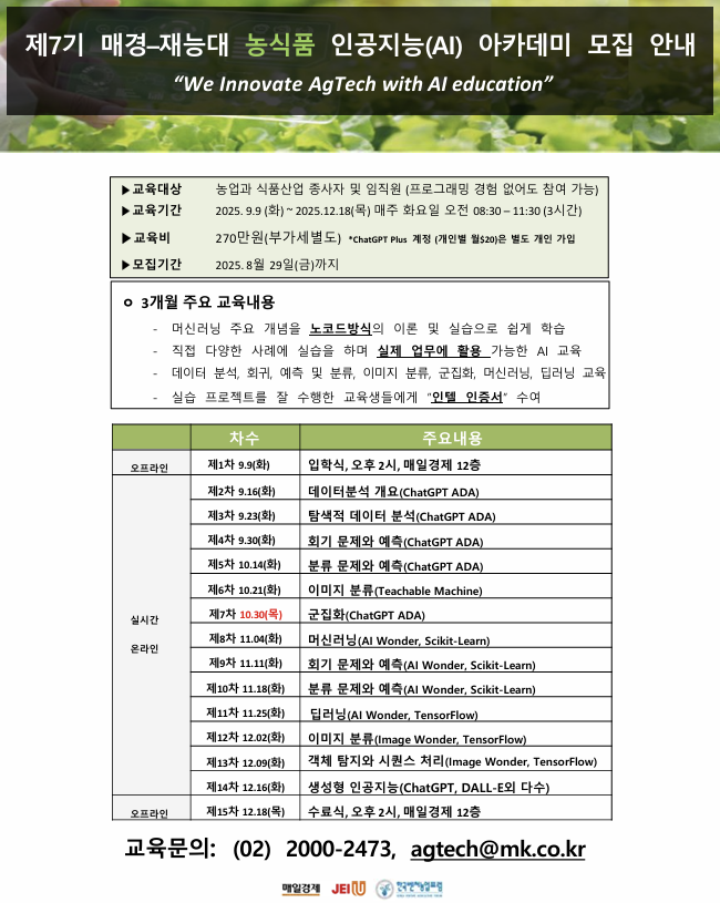 농식품AI아카데미 제7기 과정은 오는 9월 9일 개강해 총 15주간 진행된다. 교육은 주 1회 3시간씩 실시간 온라인으로 이뤄진다. 입학식과 수료식은 서울 충무로 매경미디어센터에서 진행된다.