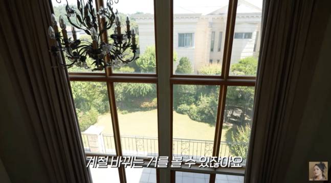 침실에서 나와 복도를 쭉 걸어가면 홈 바와 함께 고풍스러운 휴식 공간도 마련돼 있다. 또 통창으로 마당 정원을 감상할 수 있다.