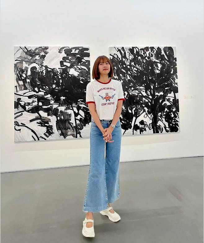 작품을 배경 삼은 사진에서도 그는 온전히 ‘본인의 무드’를 지켰다. 편안하면서도 세련된 연출, 그리고 가볍지만 센스 있는 조합이 조윤희표 일상룩의 정답처럼 느껴졌다.