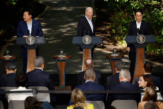 | ▲ 2023년 8월 18일 메릴랜드주 캠프 데이비드에서 윤석열 대통령, 조 바이든 미국 대통령, 기시다 후미오 일본 총리가 3자 회담 후 공동기자회견을 하고 있다. |