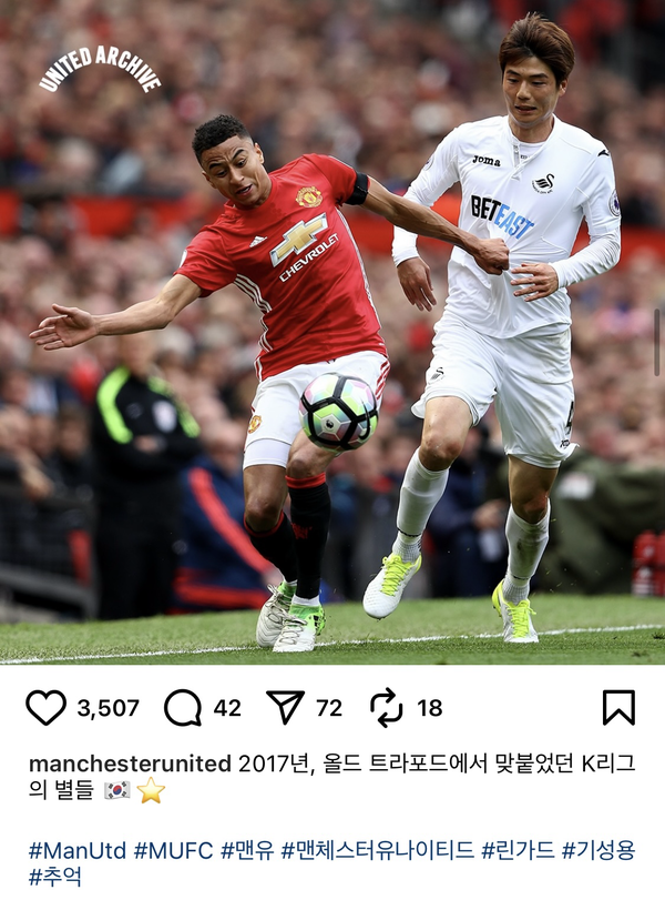 그러한 시점에서 갑자기 맨유가 기성용을 조명했다. 맨유 유니폼을 입던 시절의 린가드, 스완지 시티 유니폼을 입던 시절의 기성용이 PL 경기에서 서로 경합하는 사진을 게재하며 “2017년, 올드 트래포드(맨유 홈구장)에서 맞붙었던 K리그의 별들”이라는 문구를 덧붙였다. 기성용은 린가드에게 서울 주장 완장을 넘겨주며 함께 그라운드를 누볐지만, 이제 그 모습을 볼 수 없게 됐다.
