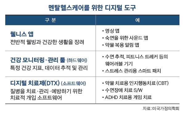 미국가정의학회는 멘탈테크를 크게 △웰니스앱(전반적 웰빙과 건강한 생활을 장려) △건강 모니터링·관리 툴(특정 건강 지표 및 데이터 추적·관리) △디지털 치료제(질병 치료·관리·예방을 위한 치료적 개입 소프트웨어) 등 3가지로 구분한다.