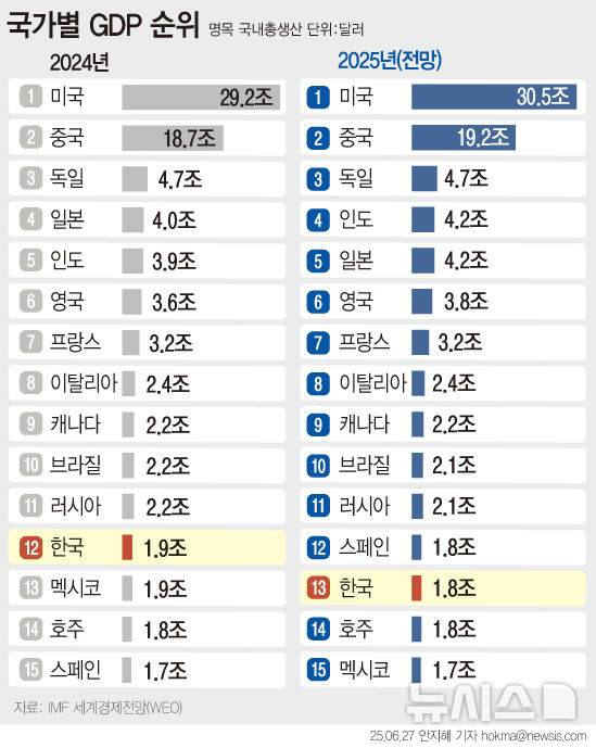 반면 우리와 경제 규모가 비슷한 스페인은 올해 2.5%, 호주는 1.6%의 성장률을 기록할 것으로 예상된다. 이들 국가는 코로나19 팬데믹 종료 이후 양호한 성장세를 이어가고 있어 우리나라의 GDP 순위는 앞으로 더 떨어질 가능성이 커졌다.
