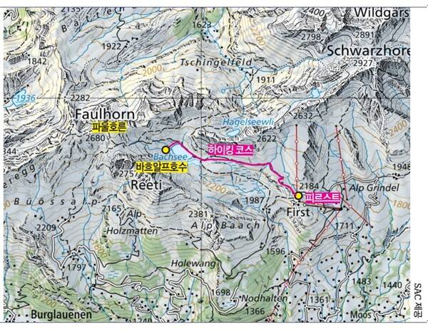 피르스트에서 2,000m대 사면을 따라 오르도록 산길이 나 있는데, 호수가 있는 지점이 독특하다. 그로젠에그(2,622m), 파울호른(2,680m), 레티(2,757m)로 이어지는 험준한 능선이 둥글게 호수를 에워싸고 있다. 근육질 킹콩이 달걀을 조심스럽게 쥐듯, 감춰놓은 호수가 바흐알프제다.