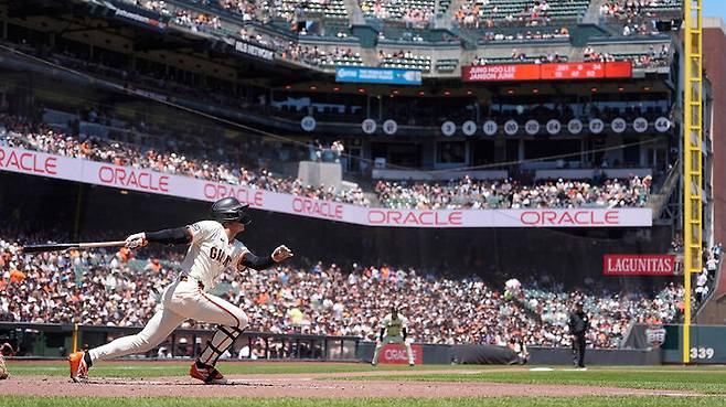 ▲ 샌프란시스코 이정후가 27일(한국시간) 미국 캘리포니아주 샌프란시스코 오라클파크에서 열린 마이애미 말린스와 홈 경기, 4회말에 우익수 쪽 3루타를 치고 있다.