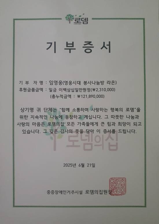 '라온'은 지난 6월 6일 로뎀의집 재건축 비용으로 1,500만 원을 기부한 바 있다.
