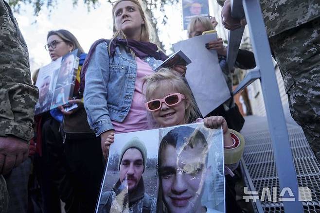 [체르느히우=AP/뉴시스] 러시아와의 포로 교환으로 석방된 우크라이나 군인들이 26일(현지 시간) 체르느히우에 도착한 가운데 4세 소녀 키라가 7개월 전 실종된 아빠의 사진을 들고 있다. 러시아와 우크라이나가 이날 추가로 포로를 교환했으며 그 규모는 알려지지 않았다. 2025.06.27.