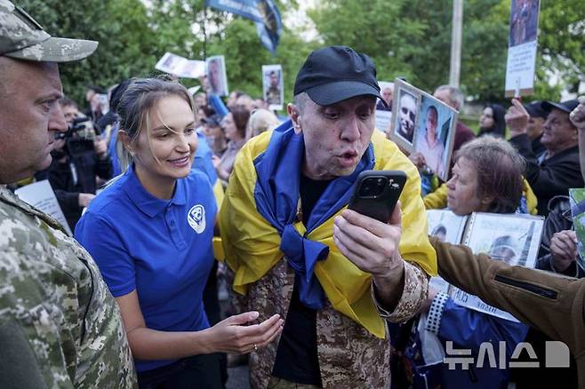 [체르느히우=AP/뉴시스] 러시아와의 포로 교환으로 석방된 우크라이나 군인들이 26일(현지 시간) 체르느히우에 도착해 가족과 영상 통화를 하고 있다. 러시아와 우크라이나가 이날 추가로 포로를 교환했으며 그 규모는 알려지지 않았다. 2025.06.27.